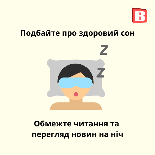 Якщо ви не є співробітником медіа або публічною особою, яка робить огляд новин, не поширюйте такі світлини. Повірте, ваші знайомі підписані на велику кількість пабліків. Якщо вони вже бачили шокуючі кадри та отримали травму, своїми діями ви підсилюєте ефект. Якщо ні - саме ваш допис може стати відправною точкою для чиїхось нічних жахів. А здоровий сон - це дуже важливо, тим більше зараз. При будь-якій можливості, давайте організму відпочинок. Оскільки усі сили зараз організм направляє на боротьбу зі стресом, тож втомлюється швидше. Перед сном, обмежте перегляд і читання новин. Подихайте свіжим повітрям, зробіть дихальну гімнастику, спробуйте розслабитись.