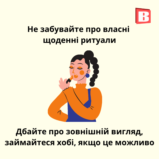 Протягом дня треба викреслювати виконані завдання. Так мозок отримуватиме “допамінове підкріплення” і відчуття досягнутого результату. Доглядати за собою, слідкувати за своєю зовнішністю. Акуратний вигляд підтримує впевненість. Спілкуватися з друзями телефоном і через соцмережі, усміхатися. Крім того, дзеркальні нейрони працюють — ваша усмішка може підтримати інших. Потрібно отримувати невеличкі задоволення. Наприклад, купувати смаколики у найближчій кав’ярні. Дати собі відповідь на запитання: “Що я отримаю, якщо повернусь до нормального життя?” І повертатись до життя.