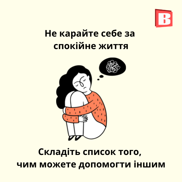 - Тут мова йде про синдром вцілілого, - каже психолог Тетяна Олексюк. Тобто коли людина відчуває провину, за те, що знаходиться у відносній безпеці. Цією провиною вона ще більше виснажує свій організм, психоемоційний стан і своє життя загалом. Запам'ятайте: якщо ви здорові, ситі, виспані та спокійні, ви можете принести набагато більше користі, ніж коли ви в поганому стані. Якщо ви все ж таки відчуваєте сором і провину – напишіть список того, як саме ви можете допомогти зараз тим, кому важче. Робіть те, що можете і вмієте.