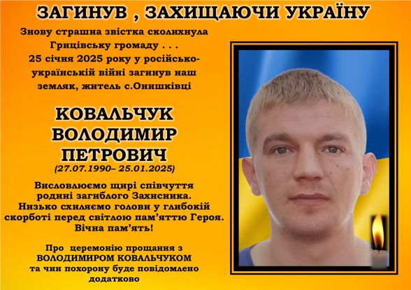 Грицівська селищна рада сповістила трагічну звістку: підтвердилась загибель солдата, який довгий час вважався зниклим безвісти. Мова йде про Ковальчука Володимира Петровича. Захисник поліг 25 січня 2025 року поблизу населеного пункту Янтарне Покровського району Донецької області.