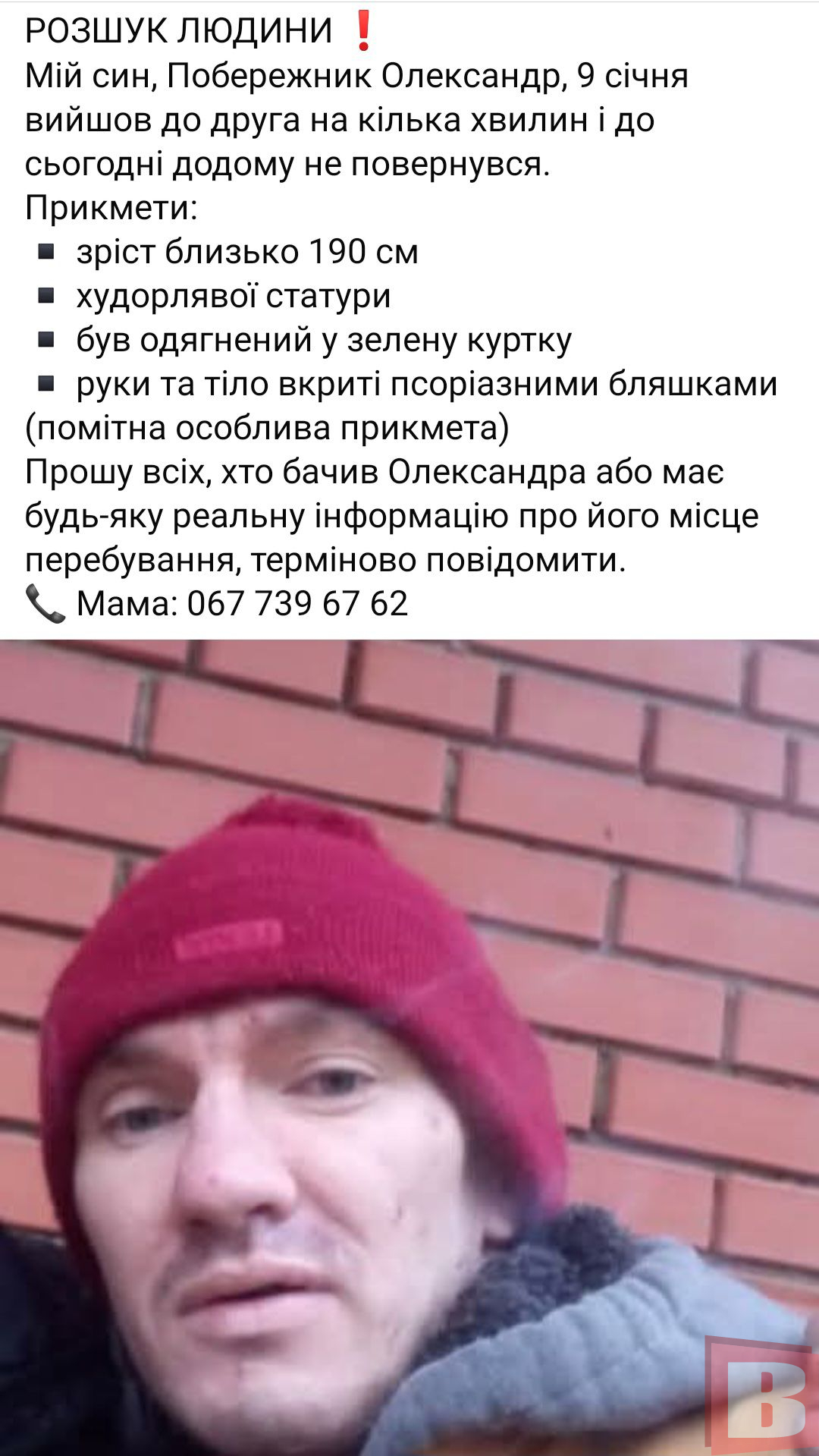 Усіх, хто бачив чоловіка або має будь-яку інформацію про його місцезнаходження, просять звертатись за номером: 067 739 6762 (мама Тетяна) або на лінію 102.