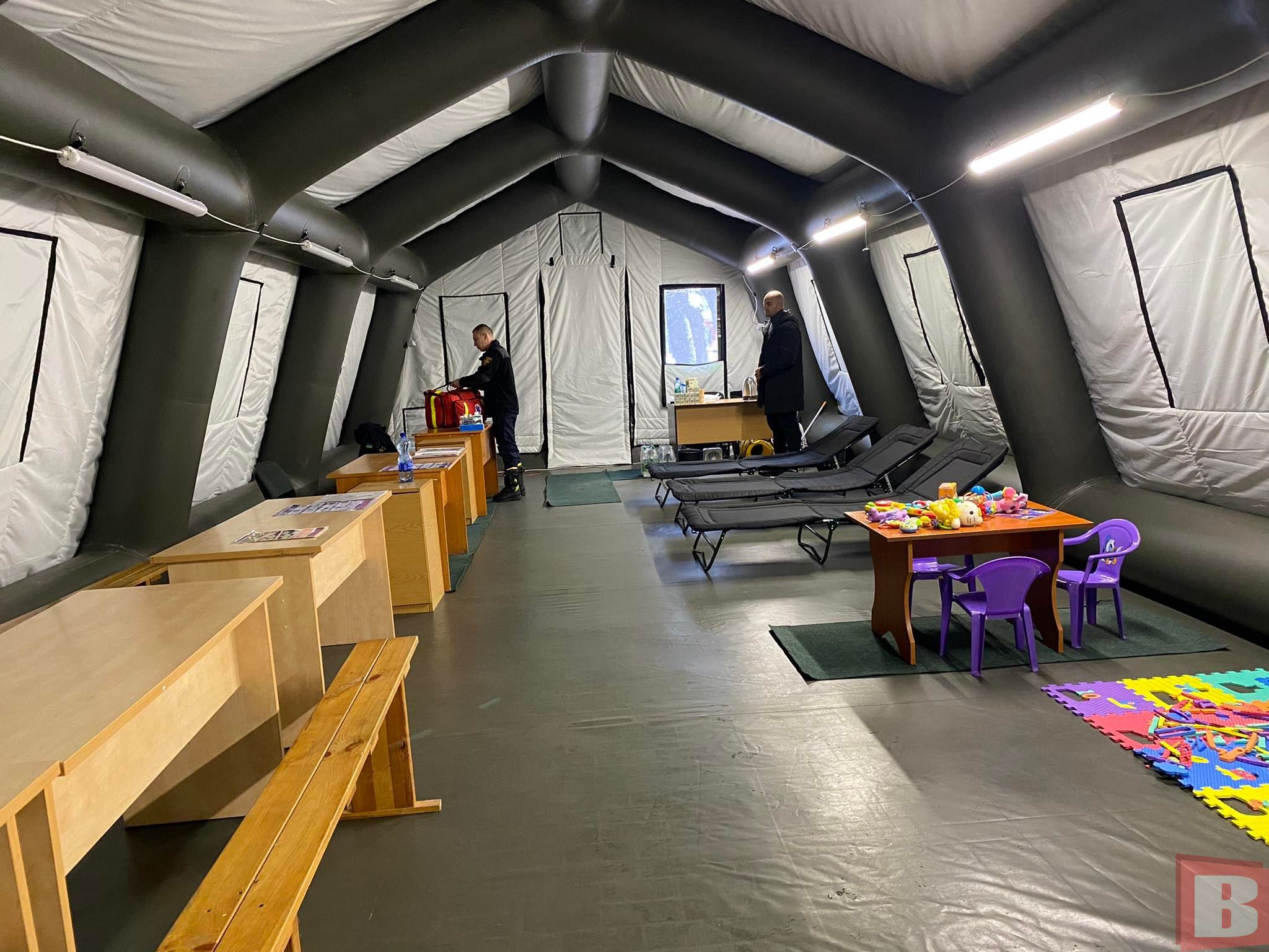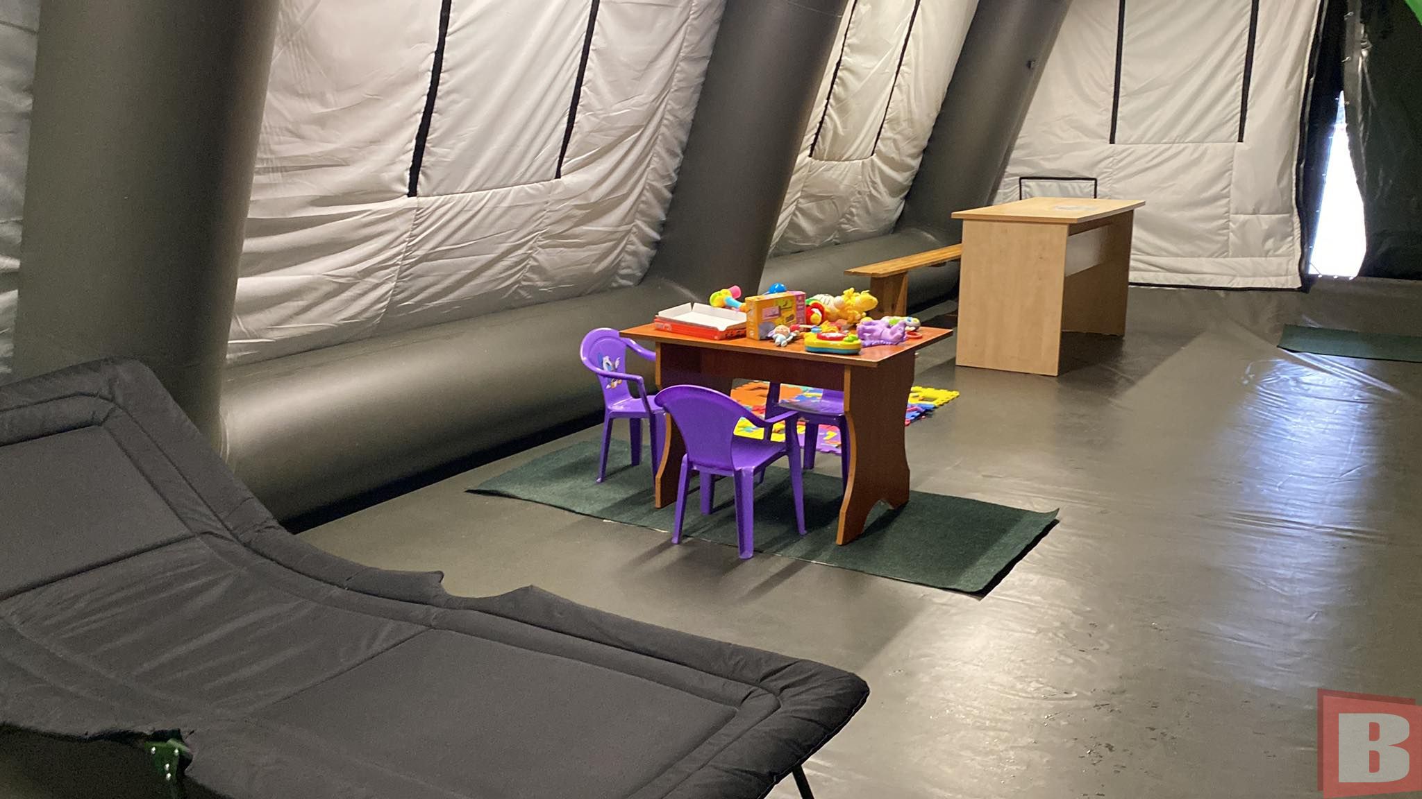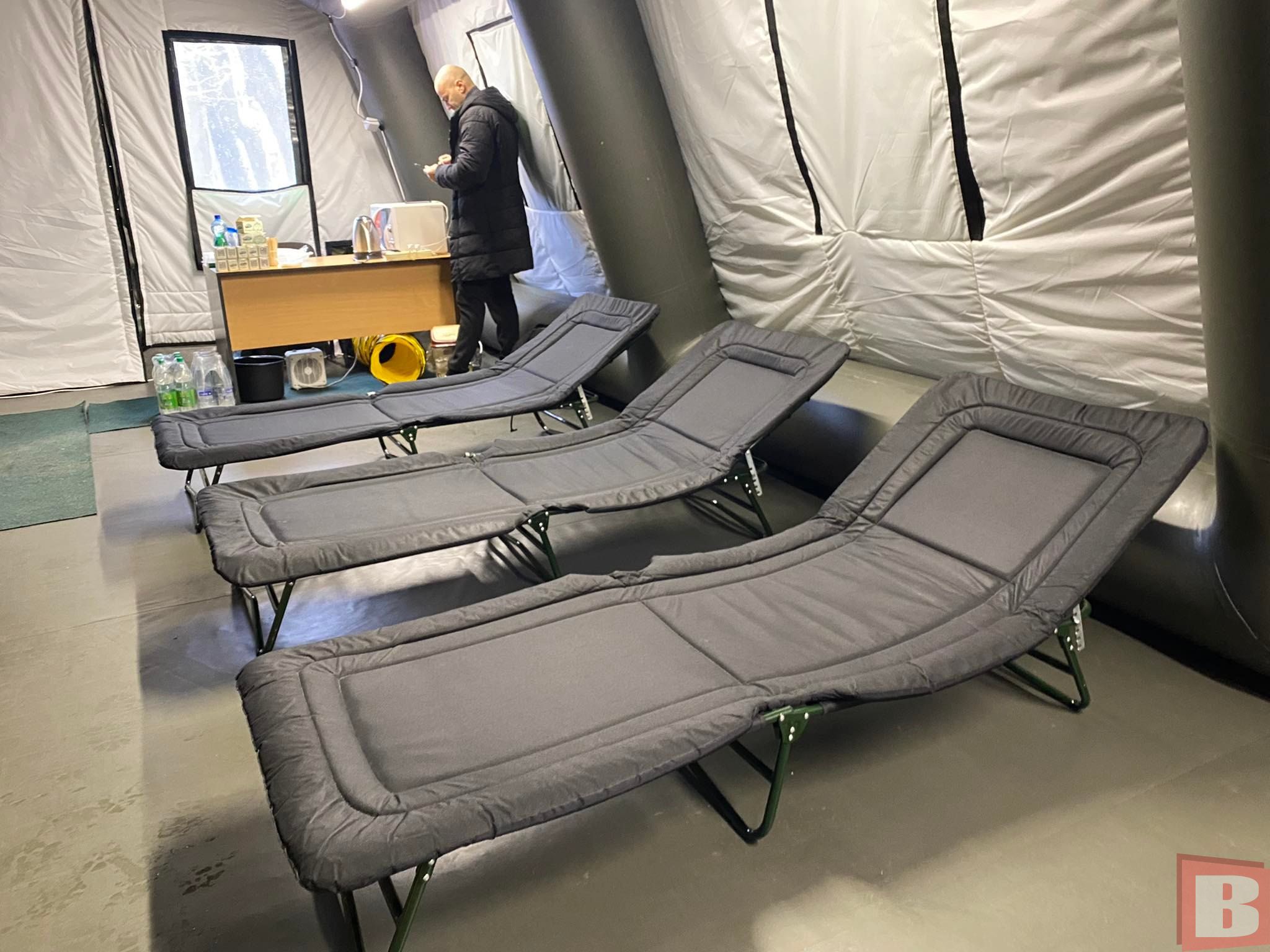 Всередині пункту незламності затишно і тепло. Намет нагрівається від 20 до 22 градусів. Тож у зимовій куртці тут навіть спекотно. По одну сторону - вздовж стоять столи та лавки. По іншу - іще один стіл, на якому зазначений пароль до двох безоплатних точок Wi-Fi. Далі - дитячий куточок із розвиваючим килимком, дитячим столиком стільцями й горою іграшок. Допоки малеча може гратися, дорослі мають змогу відпочити на ліжках, яких тут є три. Антон Танасов розповідає - їх Хмельницький отримав з Польщі.