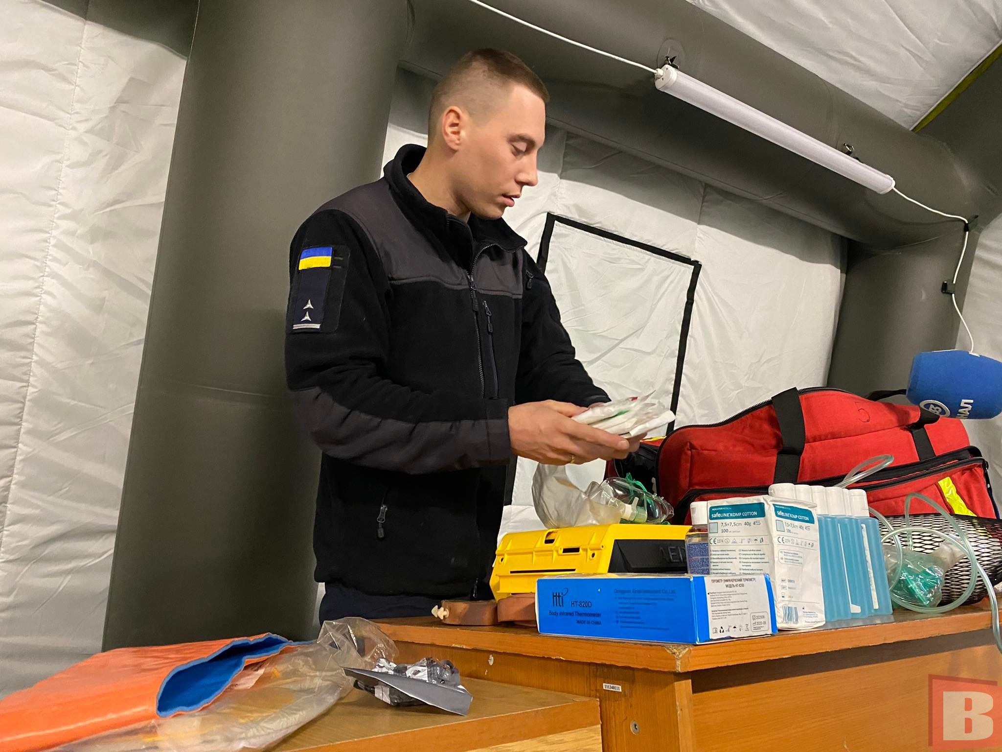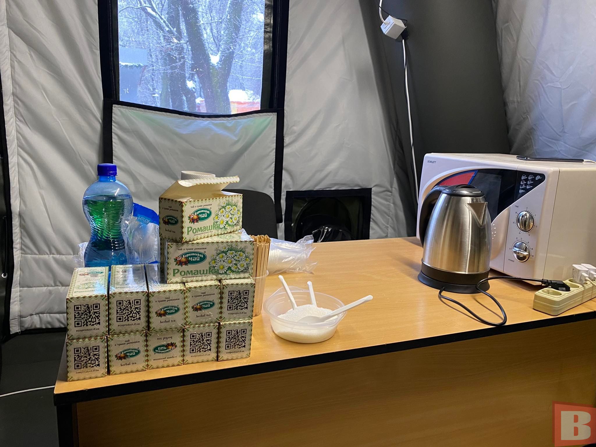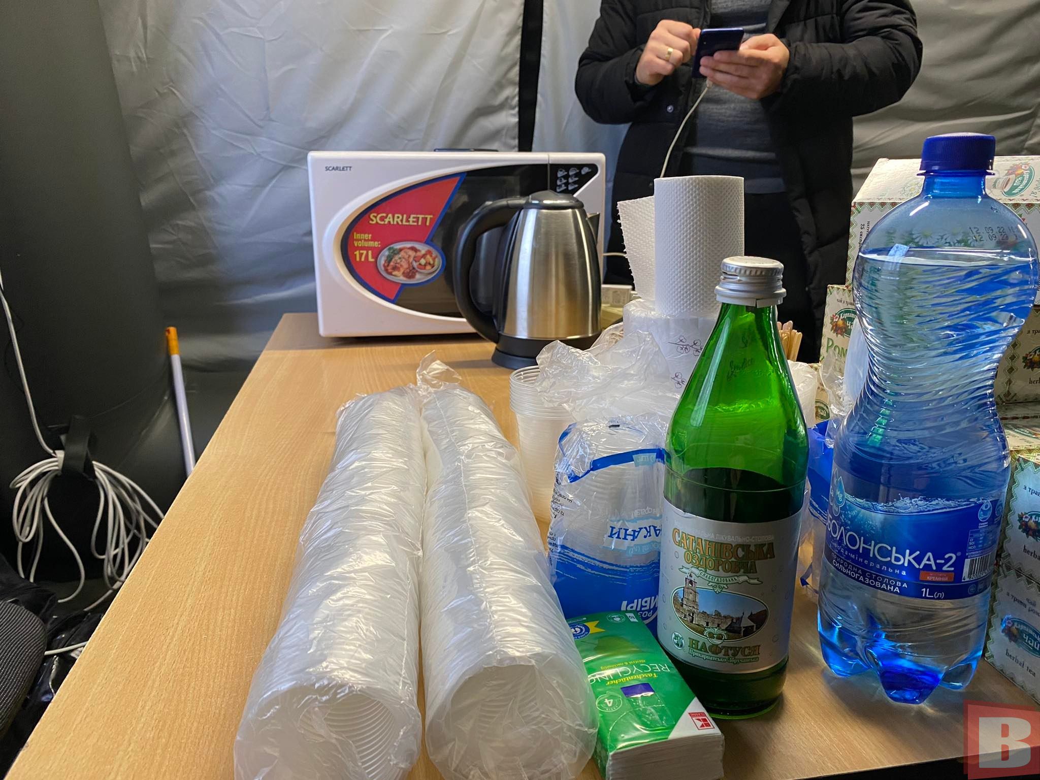 Зігрітися в наметі можна також за допомогою гарячих напоїв. Для цього всередині є чайник, чай, цукор. Також хмельничани можуть розігріти собі їжу в мікрохвильовці. Крім того, є пляшки з водою та сумка із медикаментами. Антон Танасов каже: в ній є все необхідне, аби надати людині домедичну допомогу. “Кисневий балон, киснева маска, шийний комірець, медична шина, перев’язувальний пакет, антисептики та інше”, - каже рятувальник.