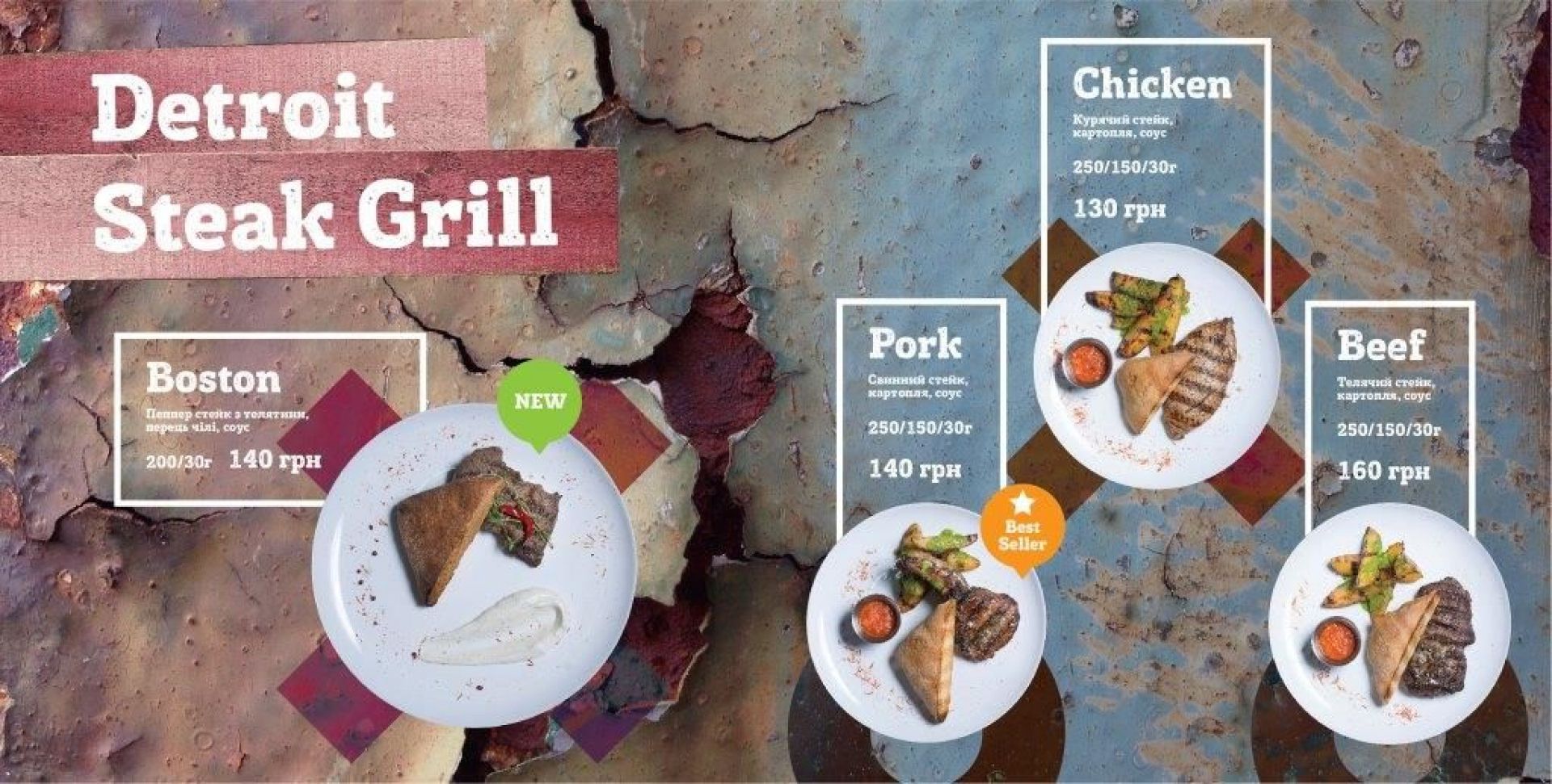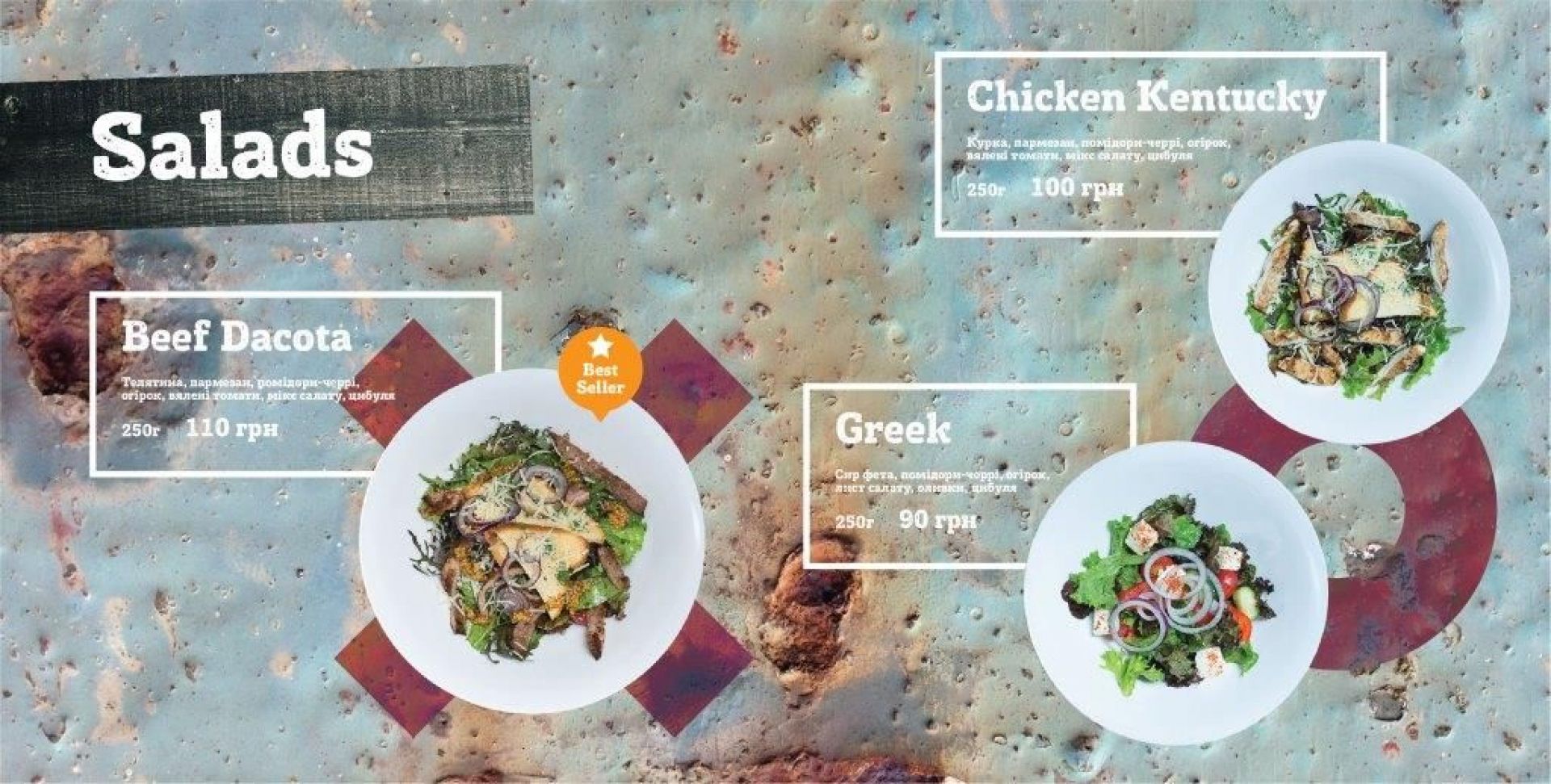 Заклад в американському стилі, декорований ексклюзивним дизайном на різні тематики. Особлива американська кухня, де приготування страв відбувається на дровяному грілю, екологічно чистих дровахтвердих порід з додаванням фруктових для придання більш насищеного смаку. Використовуться тільки екологічно чисті та найсвіжіші інгрідієнти, які закуповуються вибірково, кожного дня. Відчуєте атмосферу та смак на собі.