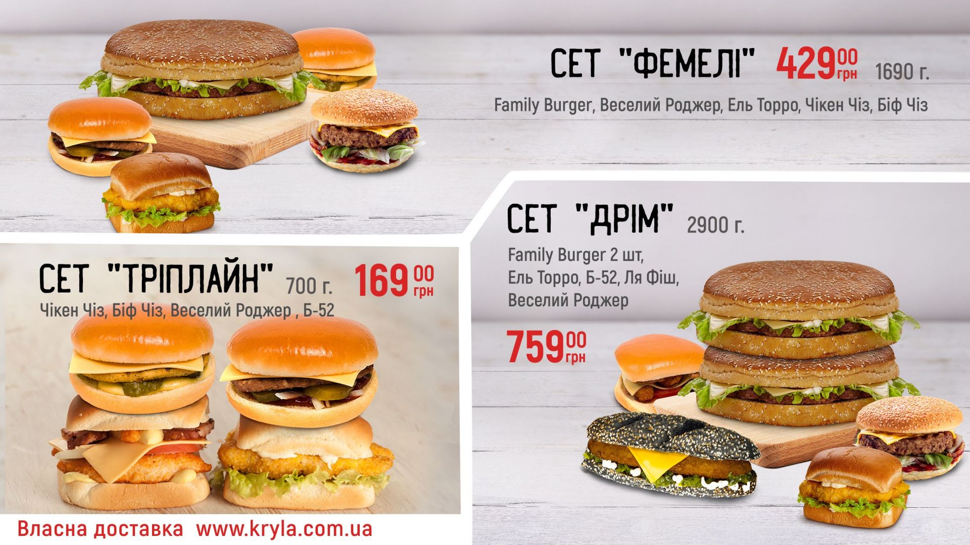 Крім цього є і картопля, снеки, салати, десерти, напої. Для маленьких відвідувачів, фаст-фуд «Крила» пропонує дитячі набори, в яких, крім бургера, картоплі та напою, діти оберуть іграшку. Завдяки привітному та професійному персоналу можна цікаво та смачно провести своє дозвілля зі своїми рідними та близькими людьми.