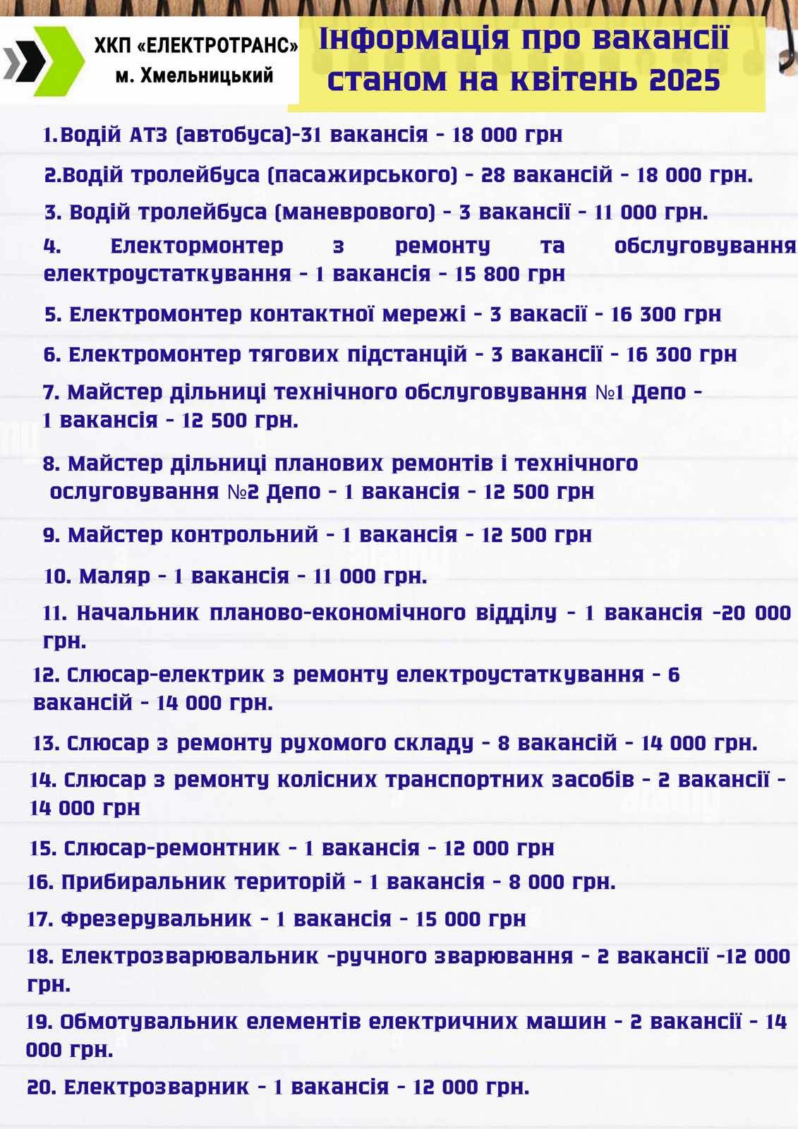 Читайте також: «Хмельницькводоканал» шукає працівників (СПИСОК ВАКАНСІЙ)