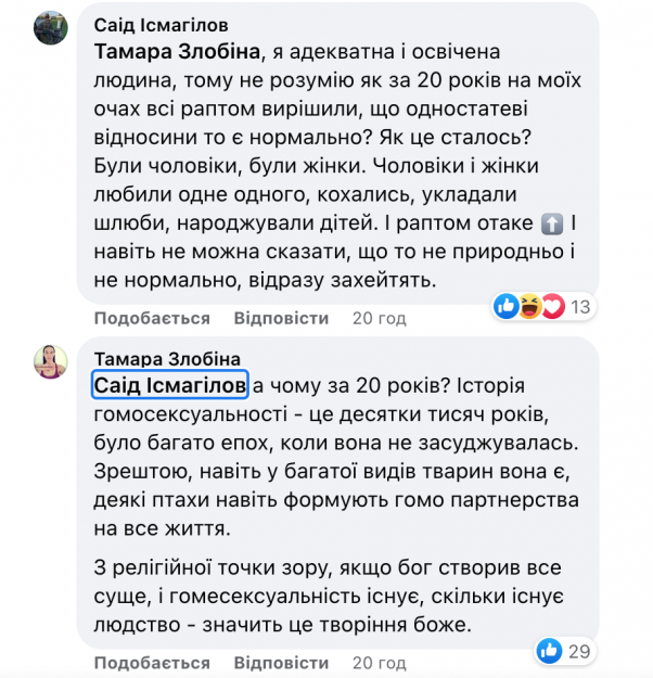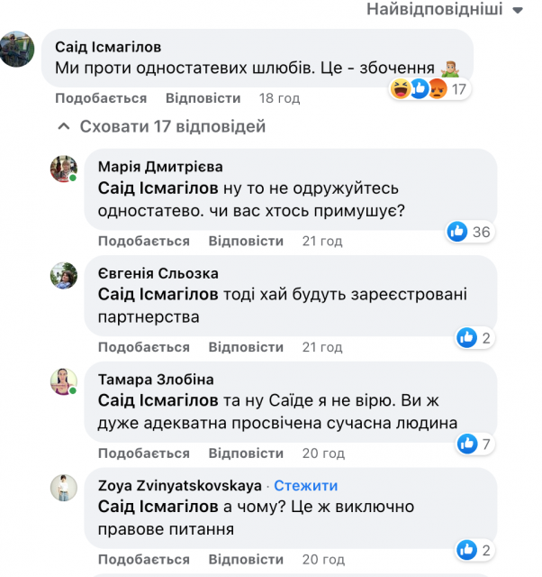 Під постом Тамари Злобіної розгорнулась жвава дискусія. Проти легалізації одностатевих шлюбів висловився Саід Ісмагілов, який довгий час був муфтієм, тобто очолював спільноту українських мусульман. А зараз він - парамедик, рятує життя цивільних та військових на передовій.