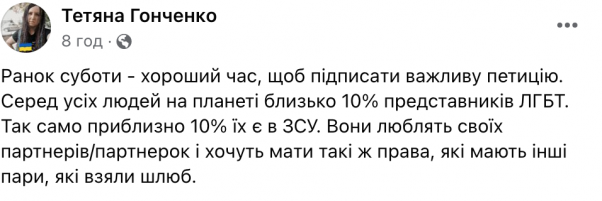 На сайті петицій до Президента України 3 червня було зареєстровано петицію про легалізацію одностатевих шлюбів. Наразі вона набрала 25 тисяч підписів і буде направлена на розгляд Володимира Зеленського.