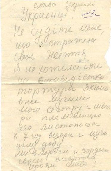 Не судіть мене що я стратила своє життя. Я не хотіла іти на енкаведівські тортури якими вже мучили мою сестру і швагра племінницю 2-го листопада в 7 год вечора і мучили цілу добу. Ми вмираємо і гордимося своєю смертю. Героям слава!