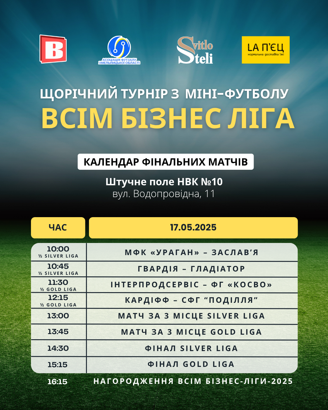 ВСІМ Бізнес-ліга у 2025 році — вже 16-й сезон традиційного турніру з міні-футболу. Його співорганізаторами є сайт «ВСІМ» та Асоціація футзалу Хмельницької області. Вже в суботу, 17 травня, будуть нагороджені кращі гравці та команди сезону. Вони визначаться за підсумками вирішальних матчів: